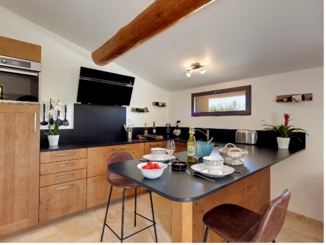 Cette bergerie climatisée possède une cuisine tout équipée, un coin salon, une chambre (d’une capacité de 2 personnes), salle de bain privative. La bergerie possède également une piscine privative avec vue sur les vignes et les oliviers.